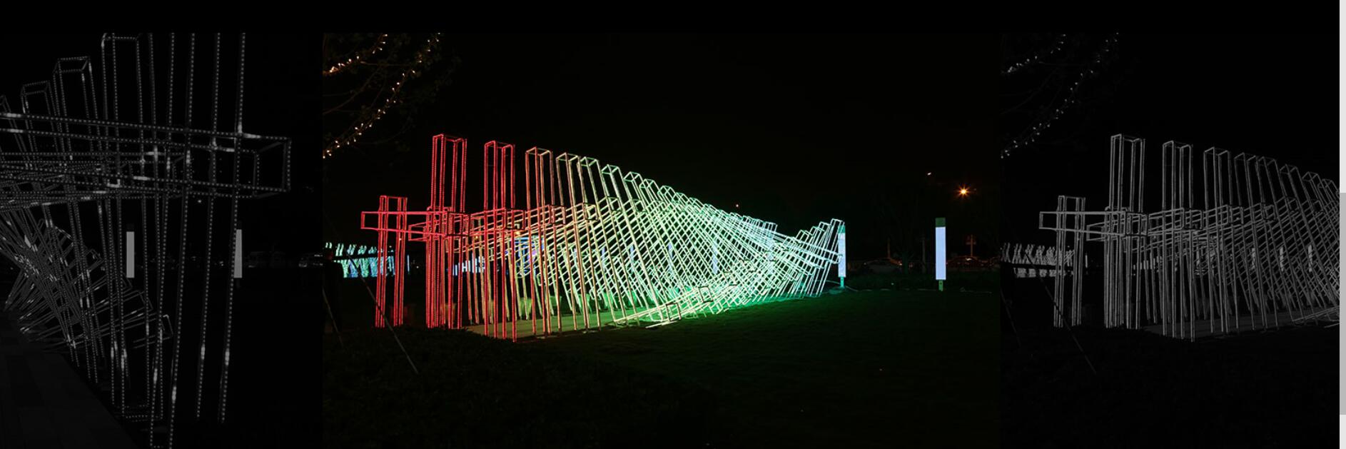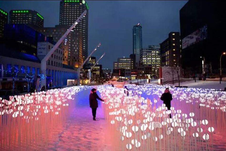 該項(xiàng)目的設(shè)計(jì)是從魁北克的麥田里得到靈感的,當(dāng)小麥迎著微風(fēng)左右擺動(dòng)時(shí),景色尤其美麗。由麥田浮動(dòng)而生的Entre les rangs裝置是由成千個(gè)靈活柔韌的莖管組成,管狀結(jié)構(gòu)頂部附有一個(gè)白色的反光膜,這些反光膜利用周圍的景觀刺激可以不斷移動(dòng)變換,充滿活力與動(dòng)感。